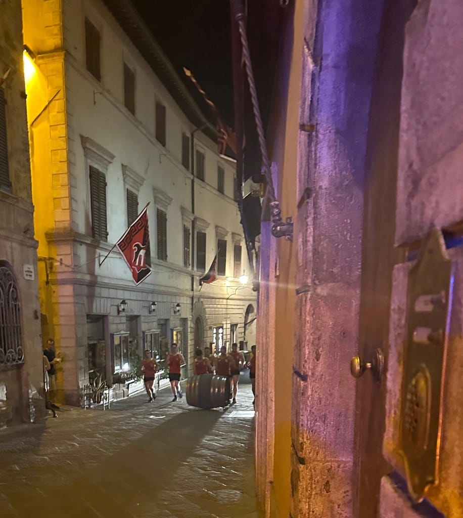 We arrived during the Bravìo delle Botti, a week long celebration that ends with teams from each neighborhood racing a wine barrel up through the city to the main square at the top, passing out, and then being carried off in an ambulance from exhaustion and the heat. It’s taken very seriously. It’s a perfect week to visit the city as it’s a homecoming and reunion for locals that have moved away. Everyone comes back to town and each evening the eight Contrade (neighborhoods) throw a street party with food, BBQ, wine and on some nights, a discotech.